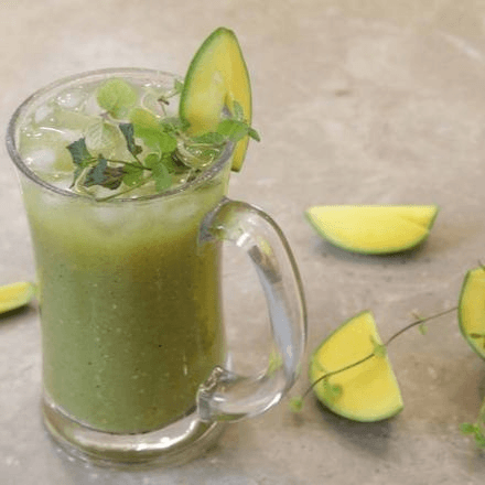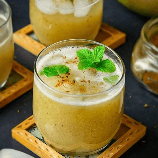 Aam panna, a refreshing Indian summer drink, typically includes raw mangoes, mint, roasted cumin powder, black salt, black pepper, and sugar