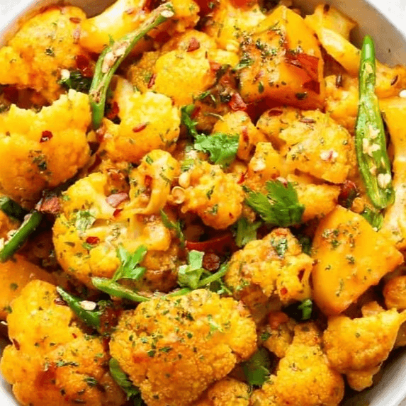 Potatoes & cauliflower sautéed with onions and fresh herbs. Served with rice