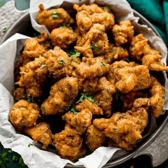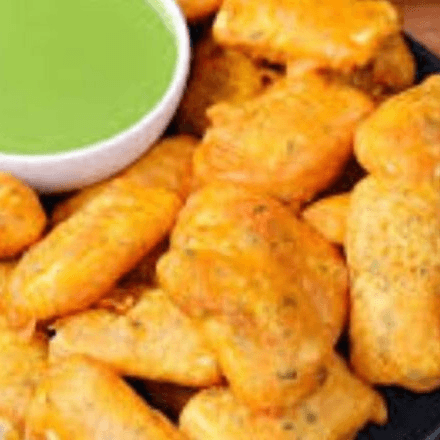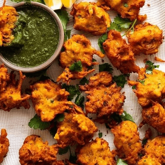 Chickpea flour, onions, potatoes, cauliflower, ginger, green chili, spinach deep fried vegetables oil, and spices