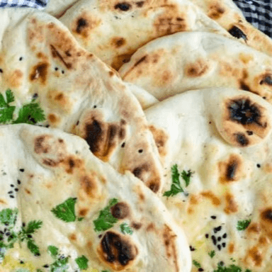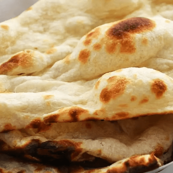 Soft, leavened white flour bread baked in a tandoor and brushed with melted butter. Light, fluffy, and a perfect match for any curry