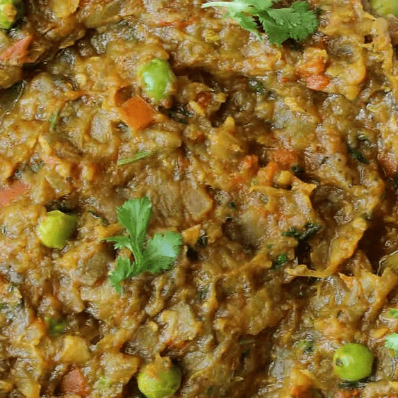 Flame cooked seasoned eggplant, sauteed onions, green peas, and tomatoes. Served with rice