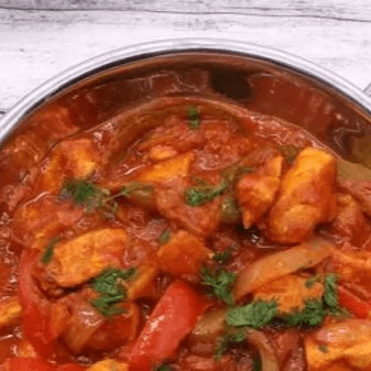 Bell peppers, onions, tomatoes, ginger, garlic, and jalfrezie spices, served with rice