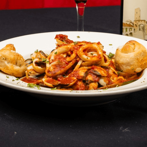 Fresh squid sauteed in white wine, olive oil, garlic & marinara sauce, served over linguine pasta (spicy on request)