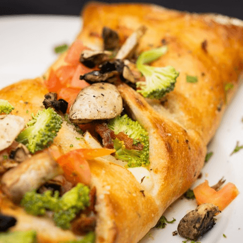 Pizza sauce, mozzarella, broccoli, green peppers, mushrooms, olives, spinach, tomatoes
