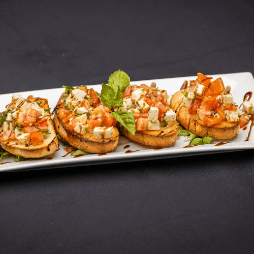 Toasted home made Italian bread crostini, topped with fresh diced tomatoes, mozzarella, garlic