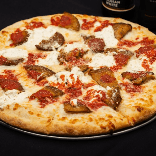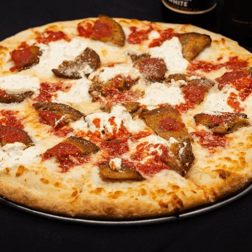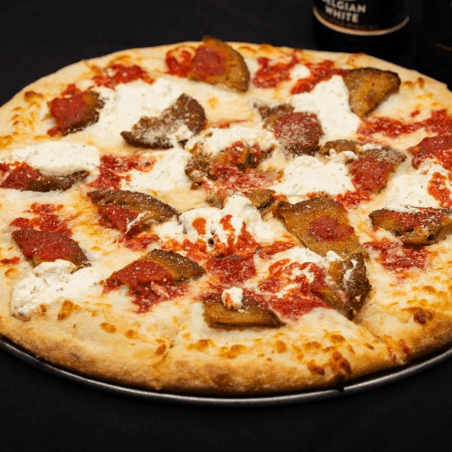 Pizza sauce, mozzarella, ricotta, Romano, eggplant
