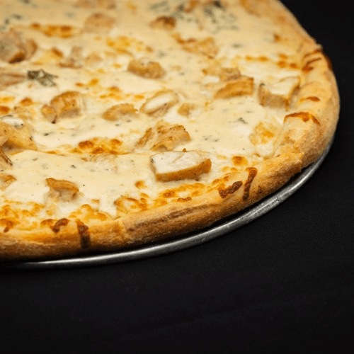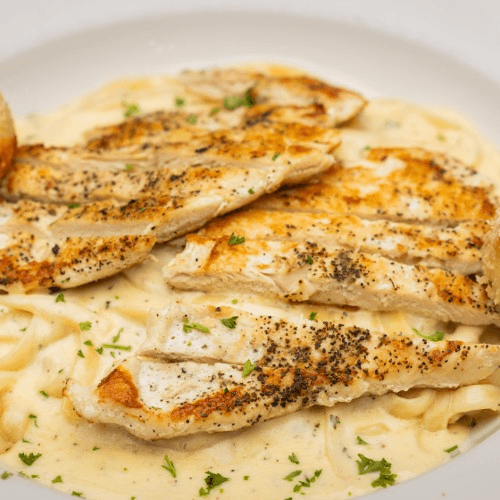 Sautéed chicken breast served over fettuccine Alfredo with garlic, bacon, and onions