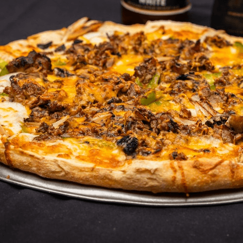 Steak, cheddar, green peppers, mushrooms