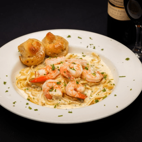 Egg battered shrimp, sauteed in lemon butter white wine sauce, served over pasta