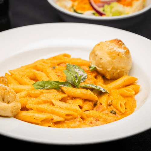 Penne in a White Wine Spicy Marinara Sauce with Tomatoes & Garlic.
